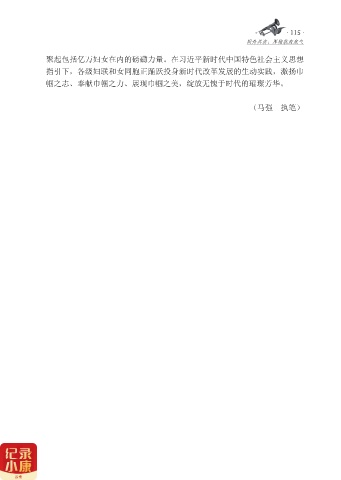 · 115 · 同舟共济:厚植抗疫底气 聚起包括亿万妇女在内的磅礴力量。在习近平新时代中国特色社会主义思想 指引下,各级妇联和女同胞正踊跃投身新时代改革发展的生动实践,激扬巾 帼之志、奉献巾帼之力、展现巾帼之美,绽放无愧于时代的璀璨芳华。 (马强 执笔)