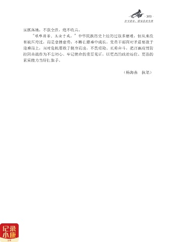 · 303 · 担当使命:锻造抗疫先锋 实抓落地,不获全胜,绝不收兵。 “艰难困苦,玉汝于成。”中华民族历史上经历过很多磨难,但从来没 有被压垮过,而是愈挫愈勇,不断在磨难中成长。党员干部面对矛盾要敢于 迎难而上,面对危机要敢于挺身而出,不畏艰险、英勇奋斗,把打赢疫情防 控阻击战作为不忘初心、牢记使命的重要见证,以更高的政治站位、更强的 素质能力当好扛旗手。 (杨海燕 执笔)
